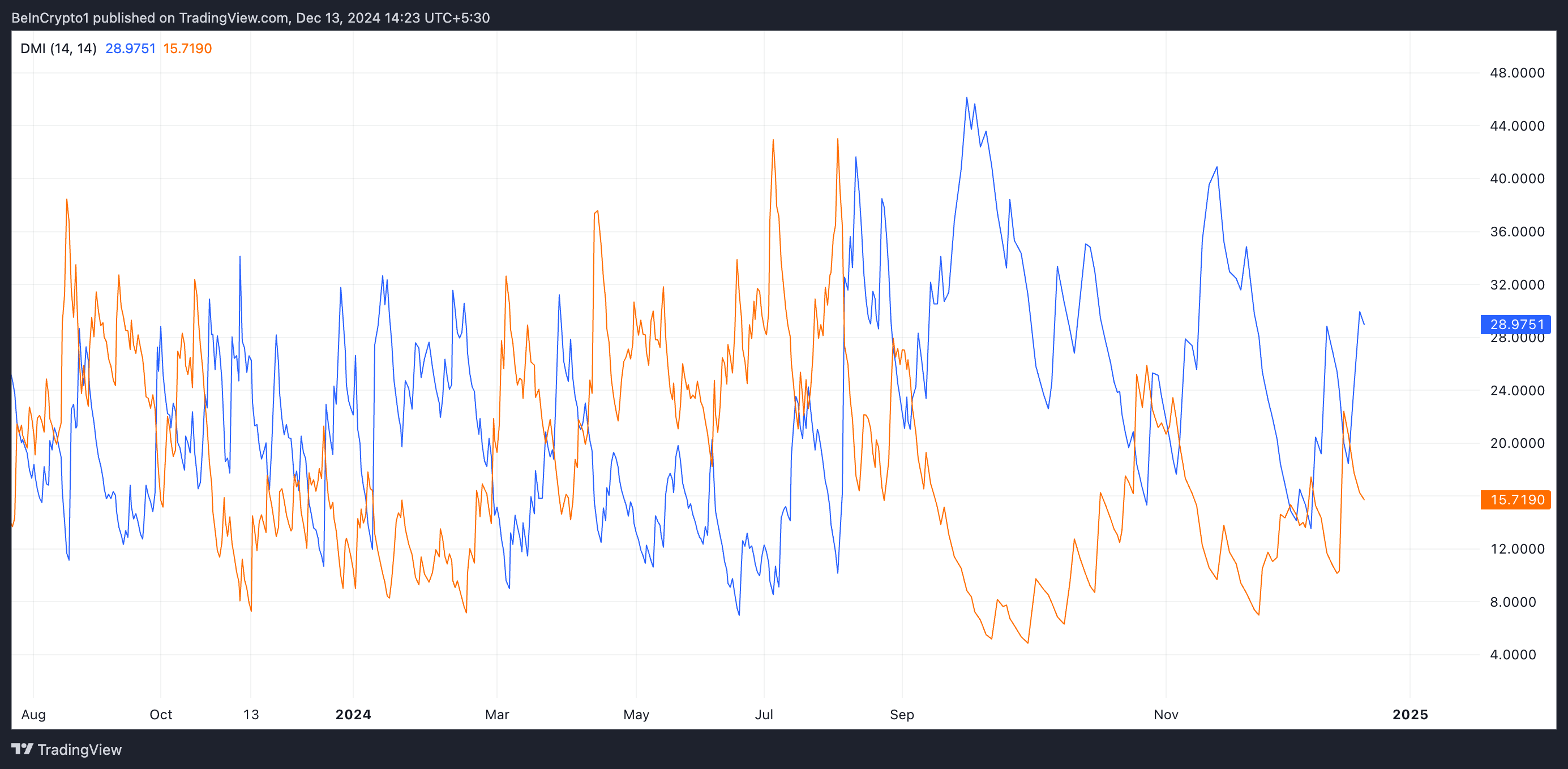 Odczyty ze wskaźnika kierunkowego ruchu (DMI) potwierdzają siłę wzrostową na rynku i dają nadzieje na wybicie SUI. W momencie publikacji, pozytywny wskaźnik kierunkowy monety (niebieski) znajduje się powyżej negatywnego wskaźnika kierunkowego (pomarańczowy).