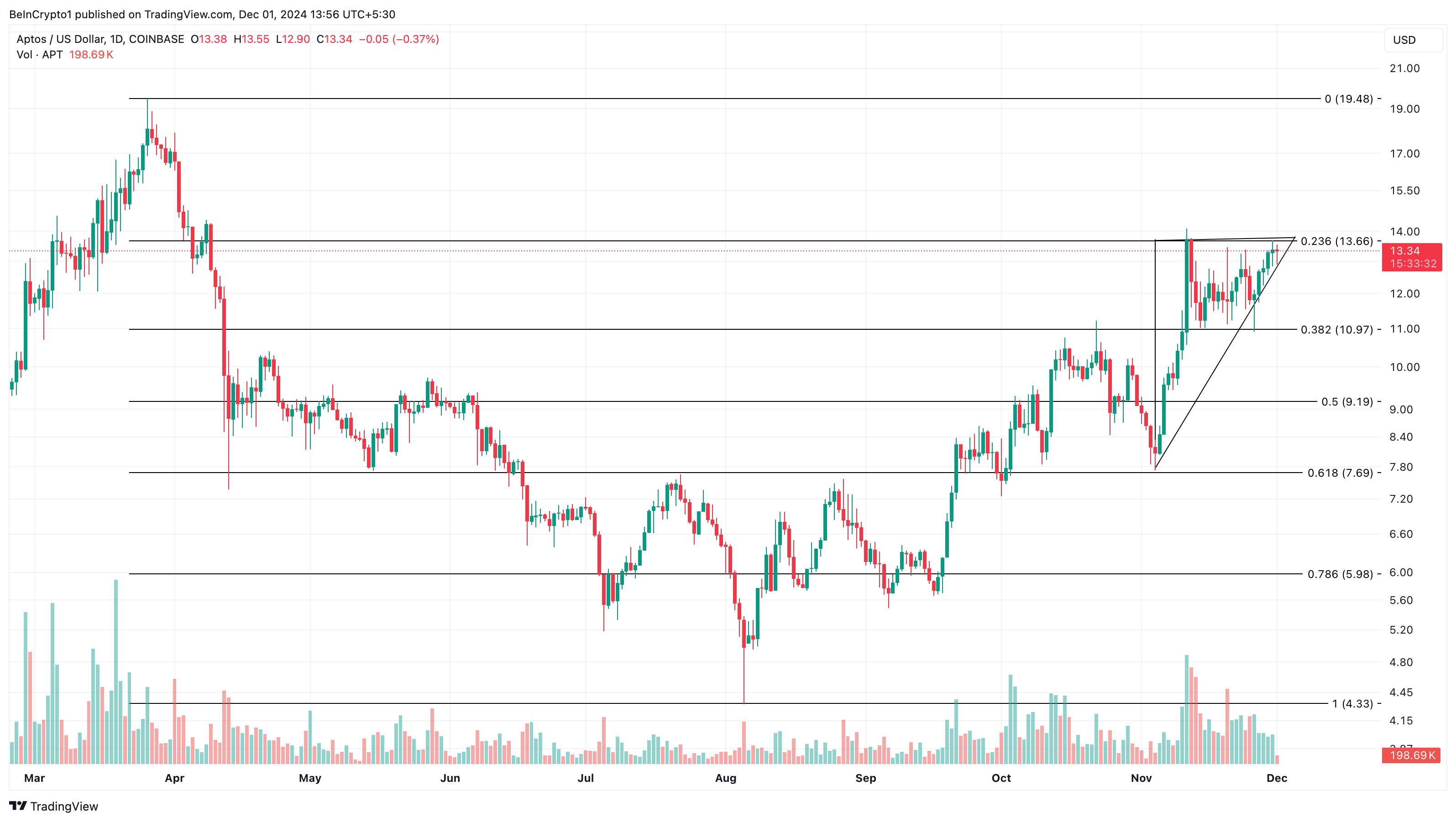 Z technicznego punktu widzenia APT utworzył rosnący trójkąt, co jest sygnałem wzrostowym. Ten wzór techniczny sugeruje, że wartość altcoina może nadal rosnąć, o ile wzrasta wolumen i popyt.