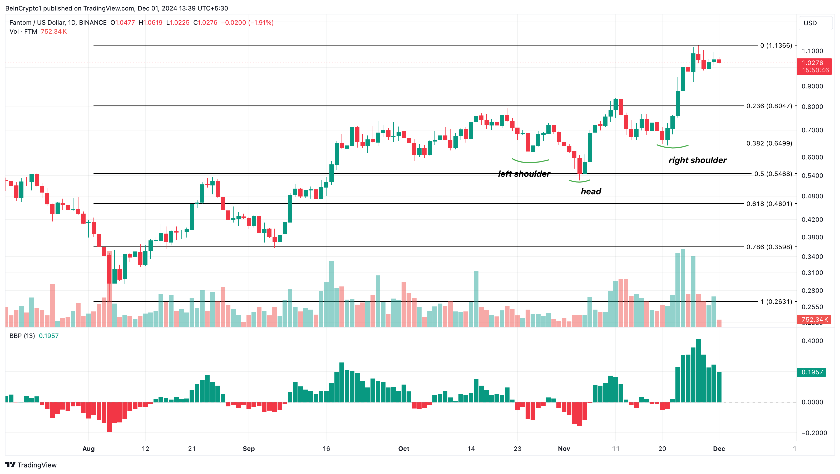Przed tym wydarzeniem cena FTM osiągnęła poziom 1 USD, dzięki wzrostowi o 60% w ciągu ostatnich 30 dni. Na wykresie dziennym altcoin utworzył odwrócony wzór głowy i ramion, co jest sygnałem odwrócenia z trendu spadkowego na wzrostowy.