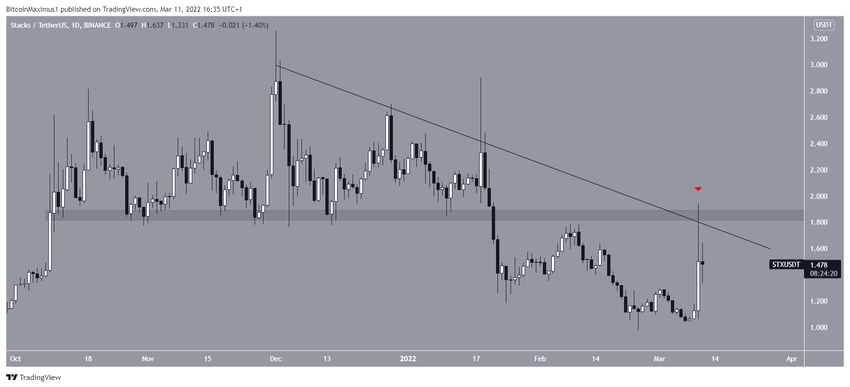 Kurs Stacks (STX) od 1 stycznia br. spada wzdłuż opadającej linii oporu. Do tej pory linia ta została potwierdzona cztery razy, ostatnio w dniu 10 marca (czerwona ikona).
