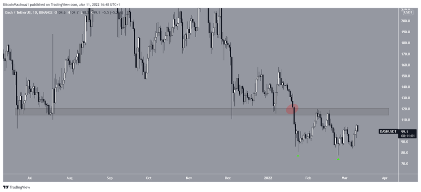 Jednak DASH nadal handluje poniżej obszaru oporu na 117 USD. Obszar ten działał wcześniej jako wsparcie od czerwca i zmienił się w opór po tym, jak kurs DASH załamał się 21 stycznia (czerwone kółko).