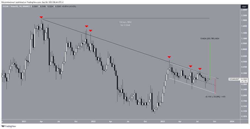 Tak więc, jeśli cena OCEAN wybije się z kanału i linii oporu, może wzrosnąć o co najmniej 200%. W ten sposób osiągnęłaby horyzontalny obszar oporu na poziomie 1 USD. Jednak kolejne odrzucenie tej linii może spowodować spadek o 35% do linii wsparcia kanału na poziomie 0,21 USD.