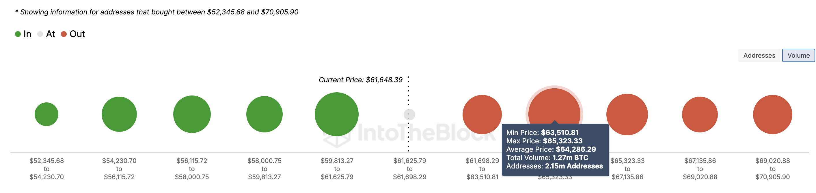 Zazwyczaj, im większa objętość, tym silniejsze wsparcie lub opór. Jak widać poniżej, 2,15 mln adresów Bitcoina trzyma 1,27 mln BTC w wymienionym przedziale. Ta objętość jest wyższa niż mniejsze wsparcie na poziomie 60 666 USD.