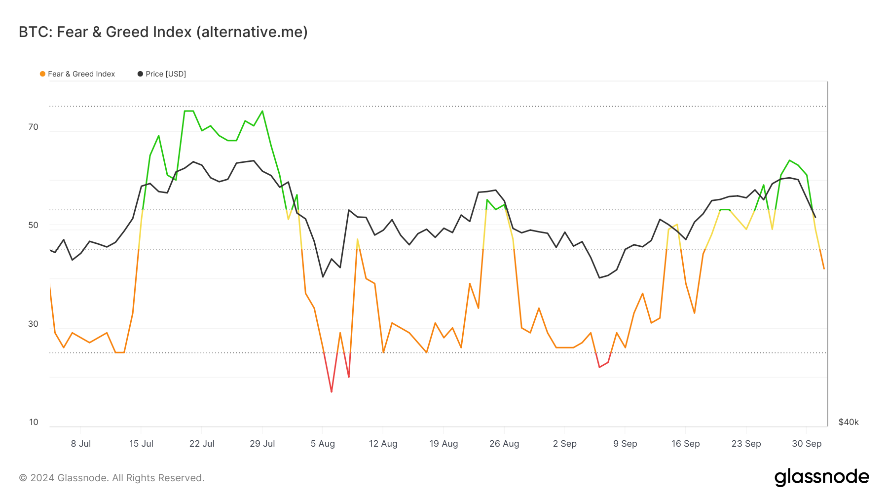 Dane Glassnode pokazują, że wczoraj Indeks Strachu i Chciwości Bitcoina wynosił 61, odzwierciedlając pozytywne nastawienie inwestorów. Ten indeks, który mieści się w zakresie od 0 do 100, ocenia sentyment rynkowy. Wartości bliskie zeru wskazują na ekstremalny strach, podczas gdy wartości bliższe 100 sugerują chciwość i optymizm.