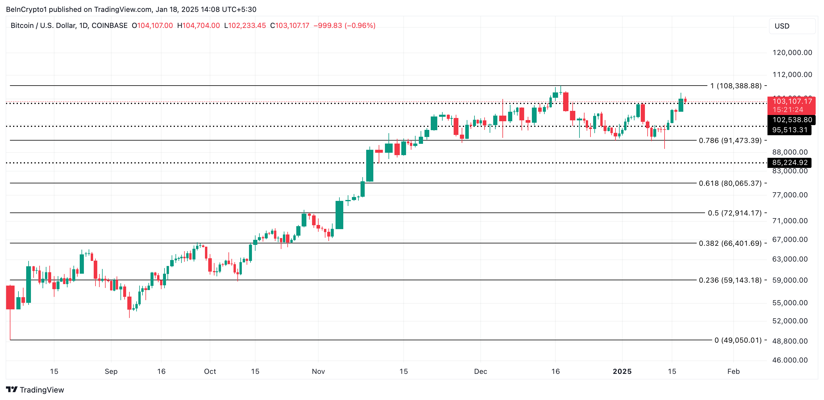 Na wykresie dziennym BTC obecnie notowany jest na poziomie 103 107 USD, nieco powyżej kluczowego oporu na poziomie 102 538 USD. Jeśli amerykańscy inwestorzy nadal będą gromadzić monety, może to dostarczyć impetu potrzebnego do wzrostu króla monet w kierunku jego rekordowego poziomu 108 388 USD.