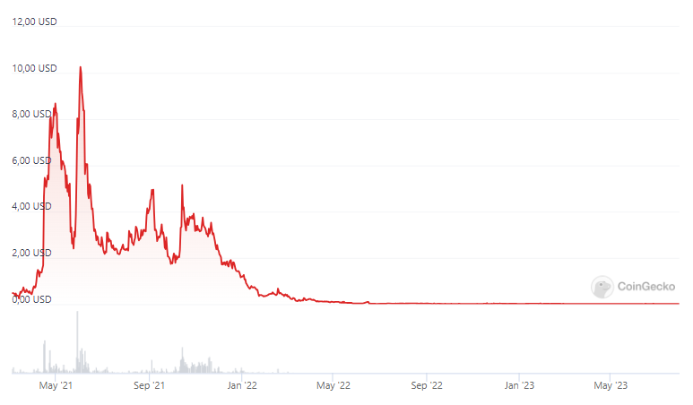Niestety projekt nie przetrwał próby czasu, co dobitnie pokazuje poniższy wykres. Tokeny warte w historycznym momencie, w 2021 roku, niemalże 12 USD, wyceniane są aktualnie na poziomie 0,0035 USD. Sam projekt nie jest już dłużej rozwijany o czym świadczyć może między innymi zamknięte konto na Twitterze.