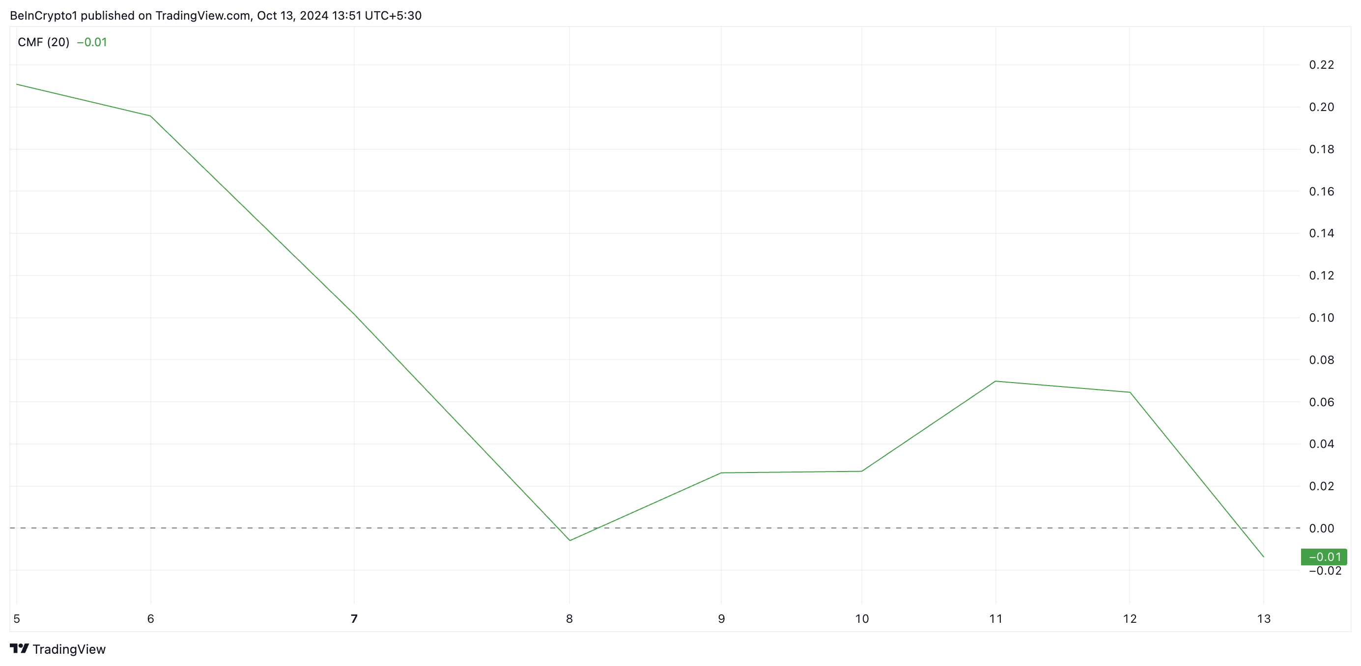 Ponadto, niektórzy posiadacze tokena zaczęli zabezpieczać swoje zyski, co widać po spadającym wskaźniku przepływu pieniędzy Chaikina (CMF). W chwili pisania tego tekstu, CMF aktywa ma tendencję spadkową i wynosi -0,01.