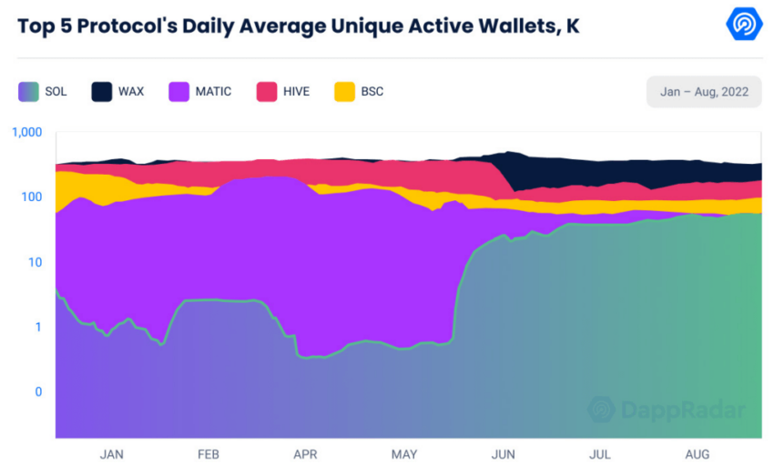 Podczas gdy zainteresowanie NFT ogólnie mogło spaść, na rynku GameFi widać rosnące zainteresowanie. W sierpniu liczba Unique Active Wallets (UAW) zarejestrowanych dziennie w tym sektorze wyniosła 847 000, przy czym Solana odnotowuje ciągły wzrost UAW z 21% wzrostem w metryce miesięcznej.