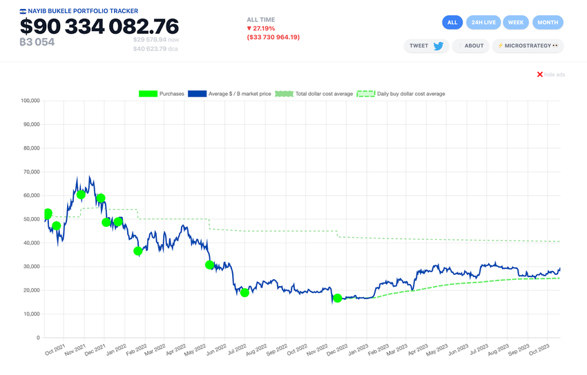 Według Nayibtracker, strony internetowej, która śledzi portfel Bitcoina należący do Salwador, kraj ten ma niezrealizowaną stratę w wysokości 33,7 mln USD. Strona internetowa pokazuje, że kraj posiada 3054 BTC o średnim koszcie 40 623 USD.