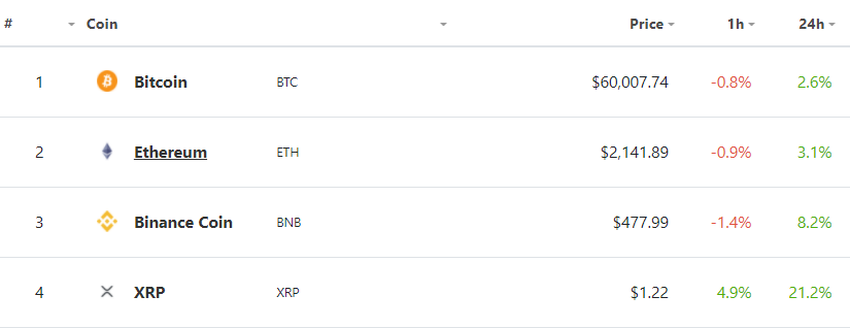 Siła rynku w sobotę sprawiła, że wszystkie cztery największe kryptowaluty zyskały na wartości. W rezultacie większość likwidacji, w ciągu ostatnich 24 godzin pochodziła z Bitcoinów, Ethereum, Binance Coin i XRP. Bitcoin podskoczył w ciągu dnia o 2,6%, a XRP wzrósł o ponad 20%.