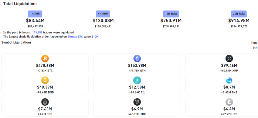 Według Bybt w ciągu 24 godzin doszło do likwidacji ponad 915 milionów dolarów. Zlikwidowano ponad 113 000 pozycji. Największa likwidacja Bitcoina, dotknęła “wieloryba”, który stracił na BitMex 10 milionów dolarów.