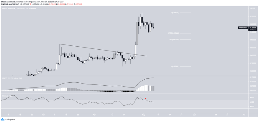 26 kwietnia MATIC wybuchł i zainicjował paraboliczny ruch, który doprowadził do nowego rekordowego poziomu 0,947 USD 30 kwietnia. Od tego czasu token spadał, ale odbił się na poziomie wsparcia zniesienia Fib 0,382 na poziomie 0,685 USD.
