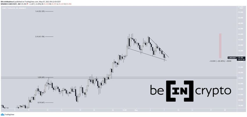 CAKE spada od 30 kwietnia, kiedy osiągnął maksimum na poziomie 44,77 USD. Wysoki poziom nastąpił tuż przy 2,61 zewnętrznego zniesienia Fib poprzedniego spadku. Jak dotąd spadł o 20%.