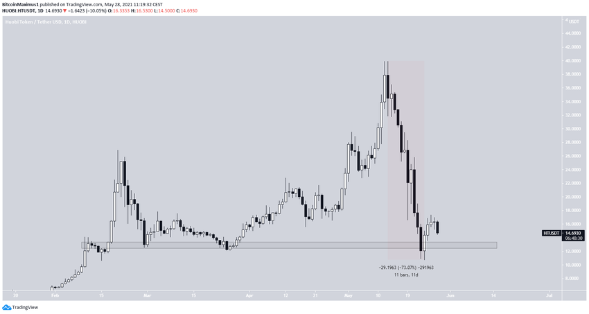 HT spada od dnia 13 maja, kiedy osiągnął nowy ATH o wartości 39,31 USD. Spadek był gwałtowny, a jego kulminacja wyniosła 10,76 USD w dniu 24 maja. Spadek wyniósł 73% w ciągu zaledwie 11 dni.