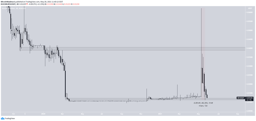 REV spadał od czasu osiągnięcia szczytu na 0,062 USD w dniu 10 maja. Spadek był gwałtowny i wyniósł 82,25%.