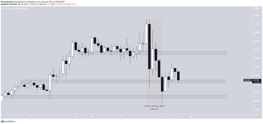 SOL spada od dnia 18 maja, kiedy osiągnął szczyt na poziomie 53,38 USD. Spadek trwał przez pięć dni, prowadząc do dołka na 19,10 USD w dniu 23 maja. Oznaczało to spadek o 67,25%.