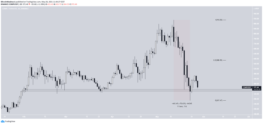 COMP osiągnął ATH o wartości 911 USD w dniu 12 maja. Następnie rozpoczął gwałtowny spadek, który trwał 11 dni, prowadząc do dołka na poziomie 267,55 USD w dniu 23 maja. Dało to łączny spadek o 70,60%.
