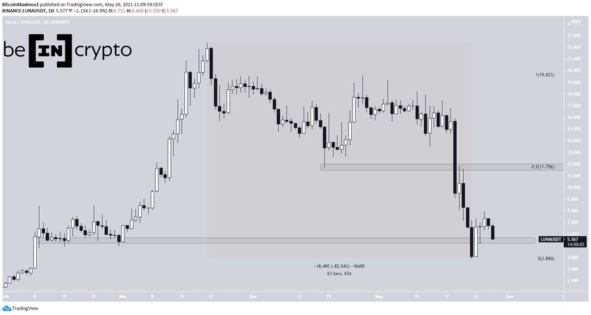 LUNA spada od dnia 21 marca, kiedy osiągnęła rekord wszech czasów (ATH) na 22,40 USD. Spadek zakończył się dołkiem na poziomie 3,91 USD w dniu 23 maja. Oznaczało to ruch w dół o 82,50% w ciągu 63 dni.