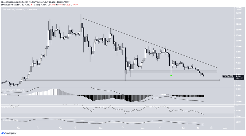 Od 19 maja THETA trzykrotnie odbił się powyżej poziomego oporu o wartości 5,50 USD, ostatnio 22 czerwca (zielona ikona).