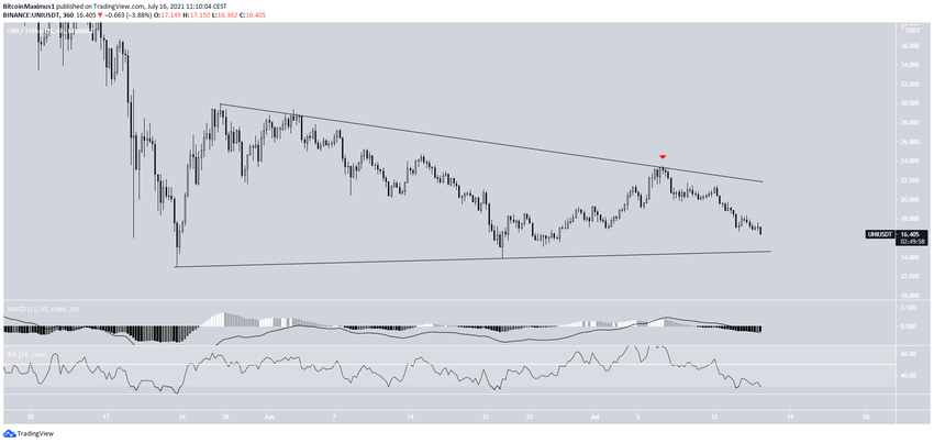UNI notowany jest wewnątrz trójkąta symetrycznego od momentu odbicia w dniu 23 maja. Niedawno został odrzucony przez linię oporu trójkąta 7 lipca (czerwona ikona) i od tego czasu porusza się w dół.