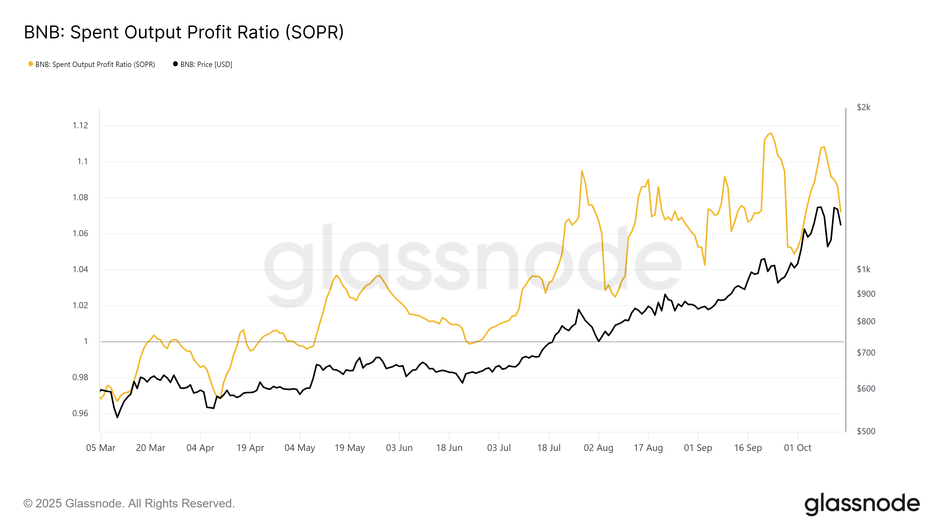 Współczynnik zysku z wydanych wyjść (SOPR) odzwierciedla wczesne oznaki malejącej rentowności wśród inwestorów BNB. Najnowsze odczyty oscylują wokół neutralnego poziomu 1,0. To wskazuje, że posiadacze realizują minimalne zyski. Choć nie oznacza to jeszcze trgedi, podkreśla, że marże zysku BNB się kurczą.