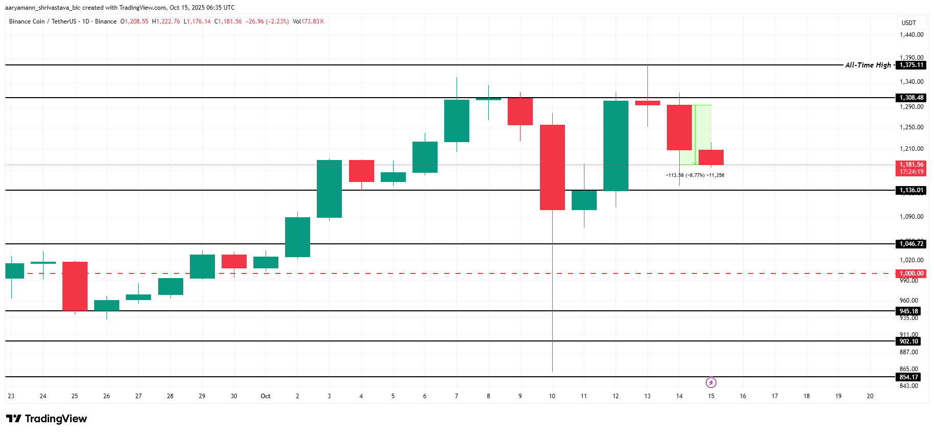 Z drugiej strony, jeśli BNB zdoła utrzymać się powyżej 1136 USD i przyciągnąć nowy kapitał kupujących, możliwy jest wzrost w kierunku 1308 USD. Decydujące przebicie tego oporu mogłoby ponownie rozpalić boom na dalsze wzrosty. To z kolei mogłoby przybliżyć BNB do testowania swojego ATH na poziomie 1375 USD i ustalenia nowego