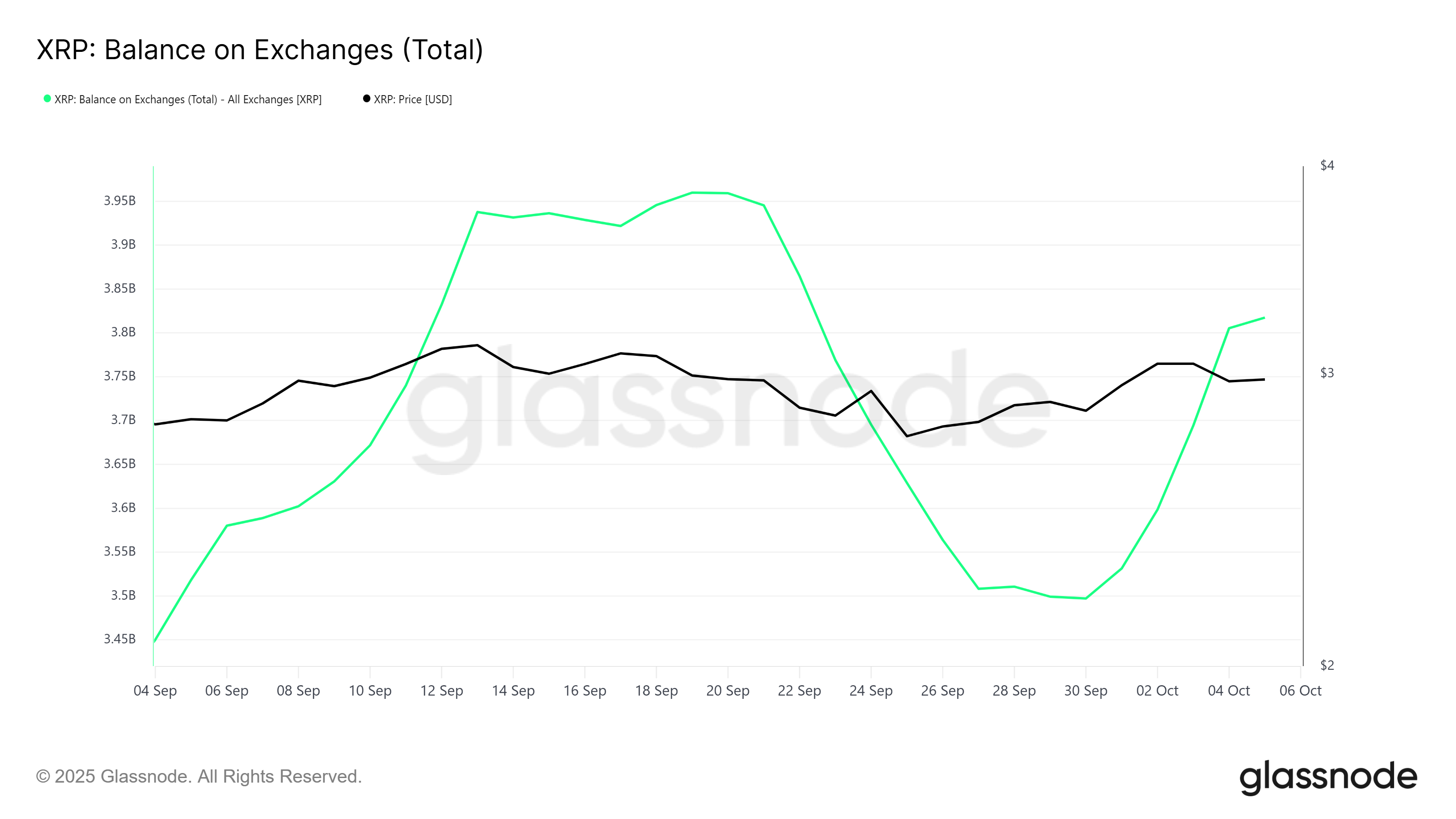 Saldo XRP na giełdach gwałtownie wzrosło, co sygnalizuje silną aktywność sprzedażową. W ciągu ostatnich siedmiu dni około 320 mln XRP, o wartości niemal 950 mln USD, zostało przeniesionych na platformy handlowe.