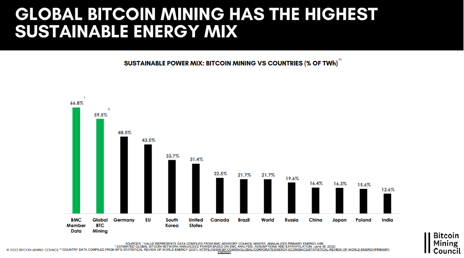 Co ciekawe, członkowie Bitcoin Mining Council działają nawet na 66,8 procentach energii odnawialnej. Obecnie ta grupa górników kontroluje 50,5 procent całego hashrate. Z takim miksem energetycznym sieć Bitcoin jest bardziej zrównoważona niż Niemcy, Korea Południowa, Stany Zjednoczone i wiele innych krajów.