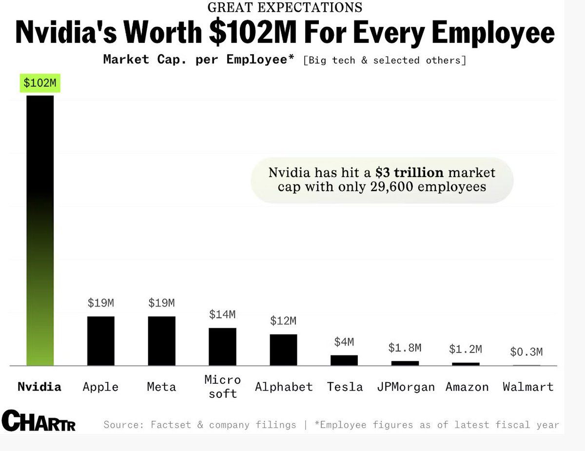 “NVIDIA przekracza kapitalizację rynkową w wysokości 3 bln USD i jest teraz warta 102 mln USD na każdego pracownika.”