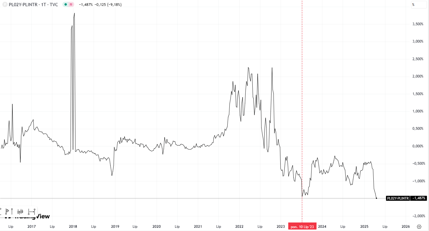 Jak zauważył Daniel Kostecki – analityk finansowy i dyrektor polskiego oddziału CMC Markets – tygodniowy wykres obligacji dwuletnich pokazuje wyraźne oderwanie się rentowności od stopy referencyjnej NBP już od lipca 2023 r. Taka różnica, sięgająca niemal 150 punktów bazowych, jest przez rynek odczytywana jako zapowiedź silnych obniżek stóp w Polsce. Inwestorzy nie ignorują tych sygnałów, a wręcz przeciwnie, wyceniają możliwy cykl łagodzenia polityki pieniężnej.