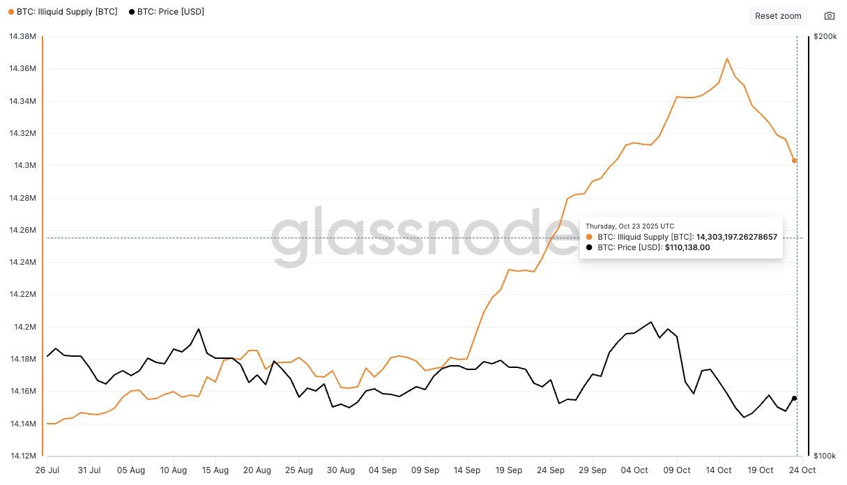 Niepłynna podaż Bitcoina zaczęła ponownie spadać, z około 62 000 BTC opuszczających nieaktywne portfele od połowy października. Ta zmiana wskazuje, że więcej monet wraca do obiegu, zwiększając potencjalną presję sprzedażową.
