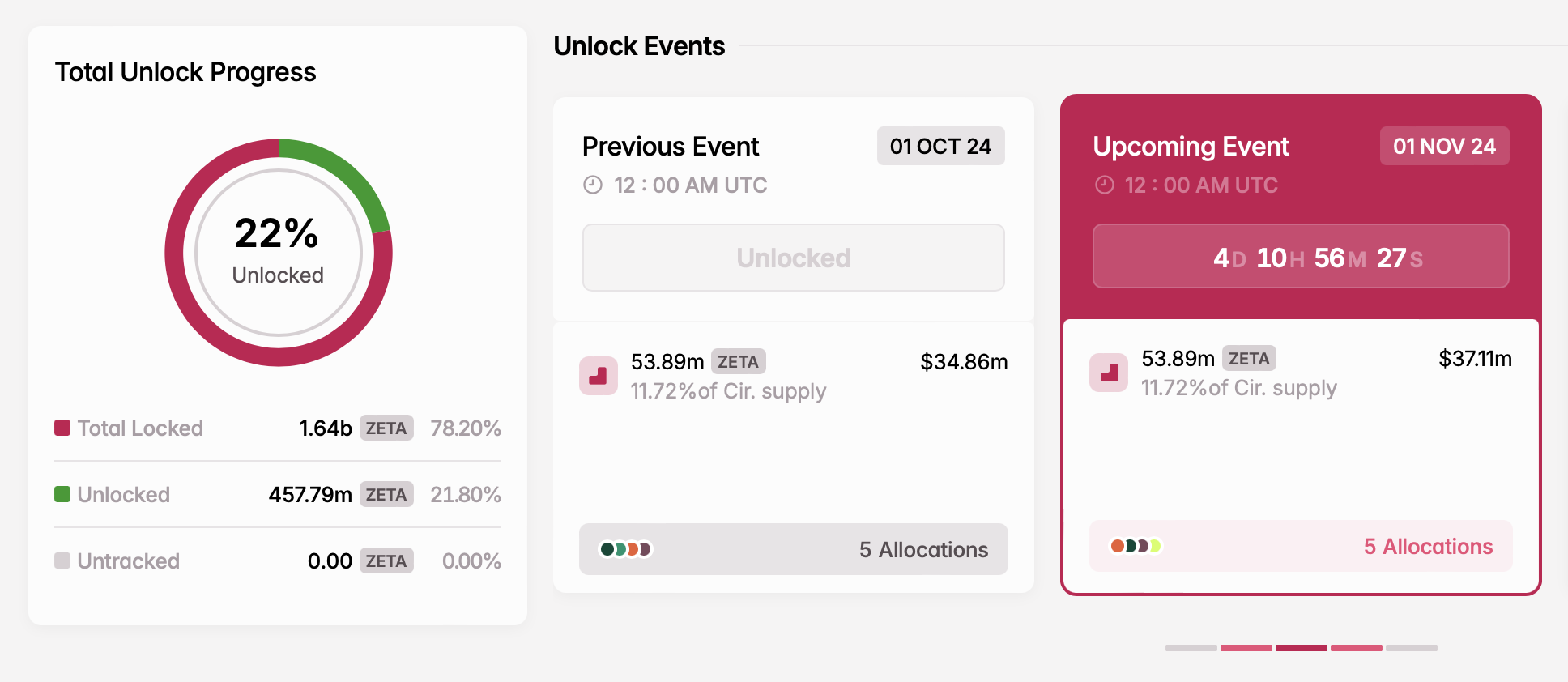 1 listopada odblokuje prawie 54 mln tokenów ZETA. Nowo wydane monety zostaną przeznaczone na kilka inicjatyw, w tym pulę wzrostu użytkowników, fundusz wzrostu ekosystemu, wsparcie dla głównych współpracowników, role doradcze i zachęty płynnościowe.