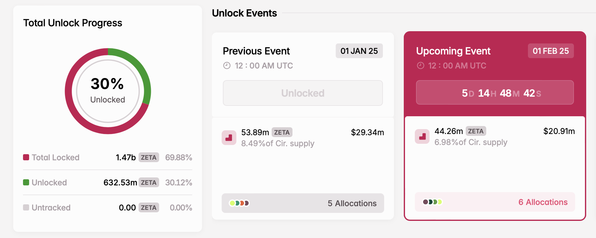 1 lutego ZetaChain odblokuje prawie 45 mln tokenów ZETA. Te tokeny sfinansują inicjatywy takie jak fundusz wzrostu użytkowników, fundusz rozwoju ekosystemu, nagrody dla kluczowych współpracowników, role doradcze i zachęty płynnościowe.
