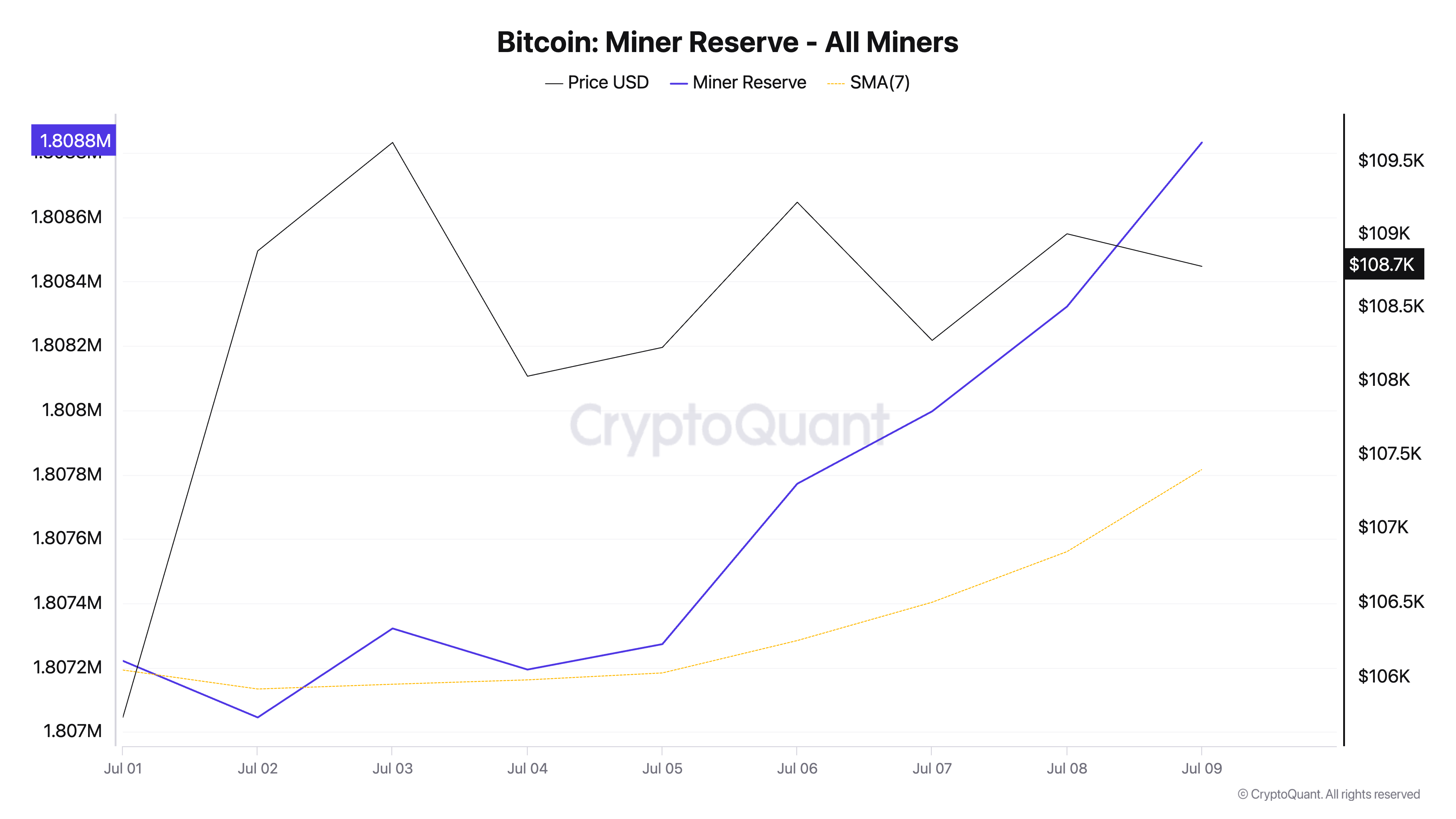 Wzrost rezerwy górników BTC od początku lipca sugeruje zmianę zachowania górników w kierunku trzymania zamiast sprzedaży, gdy rynek naciska na wzrost powyżej 110 000 USD.
