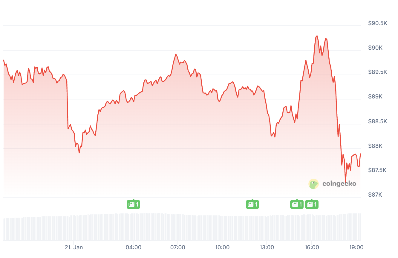 21 stycznia między 17:00 a 18:00 czasu polskiego Bitcoin doświadczył jednej z najsilniejszych godzinnych przecen ostatnich tygodni. W tym krótkim czasie z rynku zniknęło około 150 mld USD kapitału wskutek masowej likwidacji longów. Cena spadła gwałtownie z poziomu 90 000 USD do okolic 87 000–88 000 USD. Taki ruch ponownie pokazał, jak wrażliwy pozostaje rynek na nadmierne wykorzystanie dźwigni.