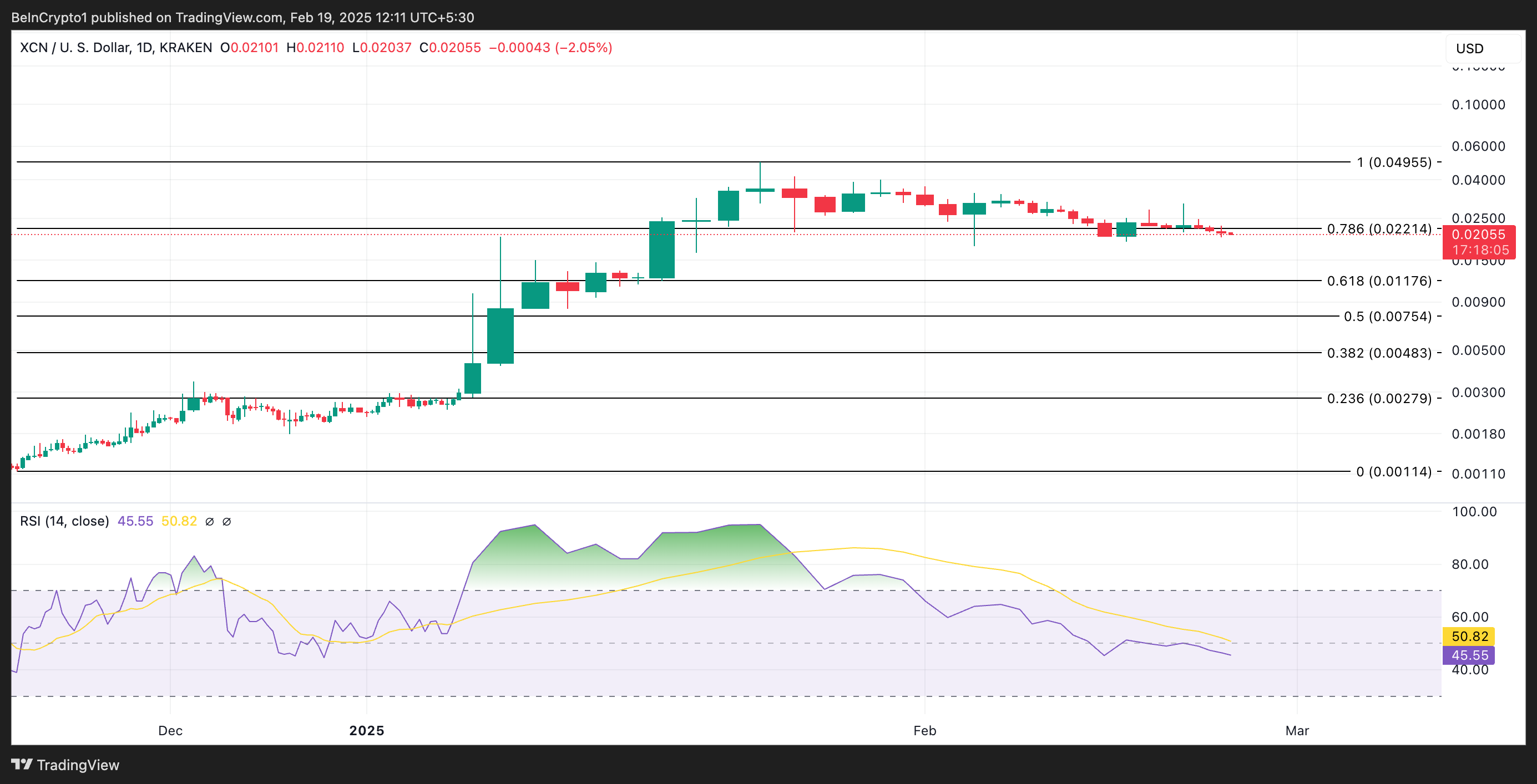 RSI dla XCN wynosi 45,55 i spada, co wskazuje na słabnący byczy impet, gdy sprzedawcy wzmacniają swoją kontrolę. Jeśli to się utrzyma, cena tokena może spaść do 0,011 USD.