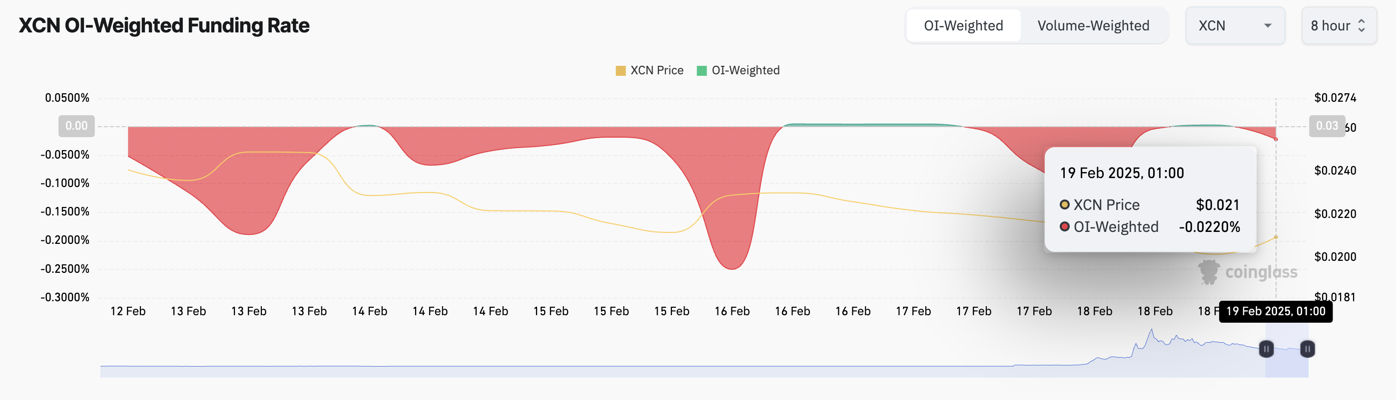 Historycznie ujemne wskaźniki MVRV są postrzegane jako sygnały kupna. Jednak stały spadek XCN w ciągu ostatniego miesiąca osłabił bycze nastroje wśród posiadaczy, z których wielu teraz obstawia dalsze straty.