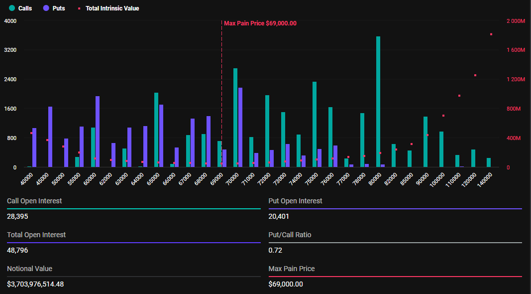 Według danych z Deribit dzisiaj, 8 listopada, wygasają opcja na Bitcoina i Ethereum. Te pierwsze łącznie zawierają 48 794 kontraktów o wartości około 3,7 mld USD. Kontrakty na BTC mają stosunek put do call wynoszący 0,72 i punkt maksymalnego bólu na poziomie 69 000 USD.