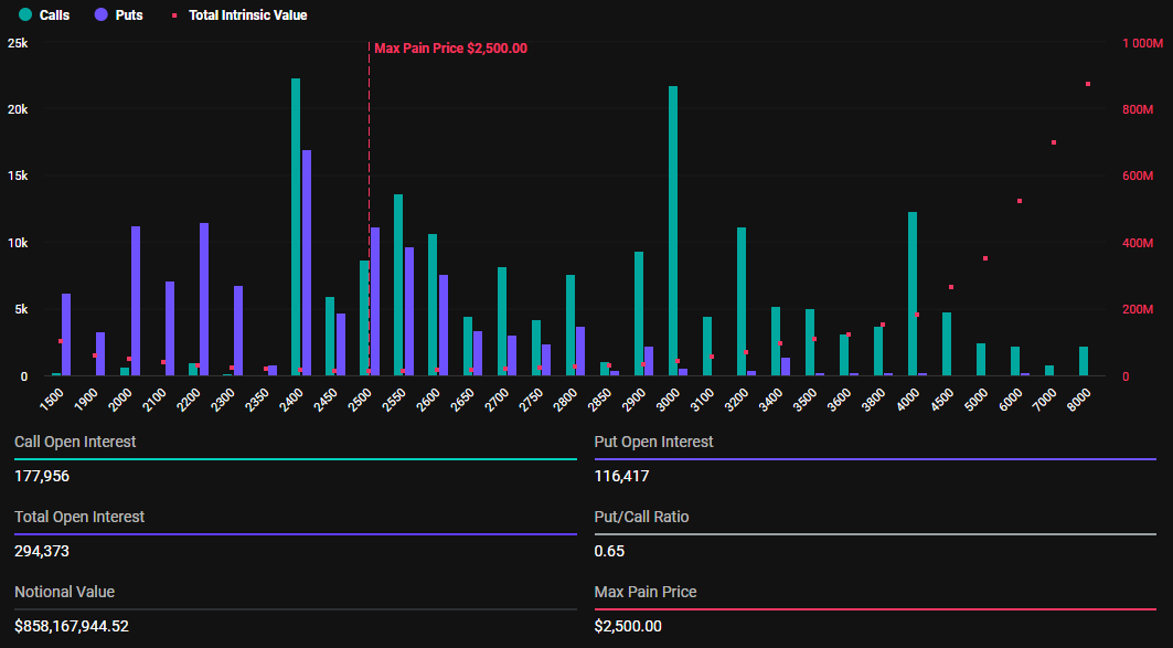Podobnie rynek opcji na Ethereum wygasa z 294 380 kontraktami o wartości 854,88 mln USD. Dzisiejsze wygasające kontrakty na Ethereum mają stosunek put do call wynoszący 0,65, z punktem maksymalnego bólu na poziomie 2500 USD.