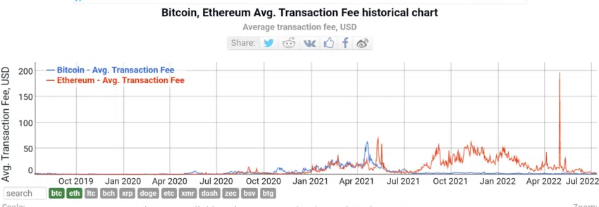 Średnia opłata za transakcję w sieci ETH spadła od tego czasu o 99% do 2,61 USD na dzień 12 lipca. Może to być spowodowane spadkiem aktywności w branży DeFi pośród załamania rynku kryptowalut.