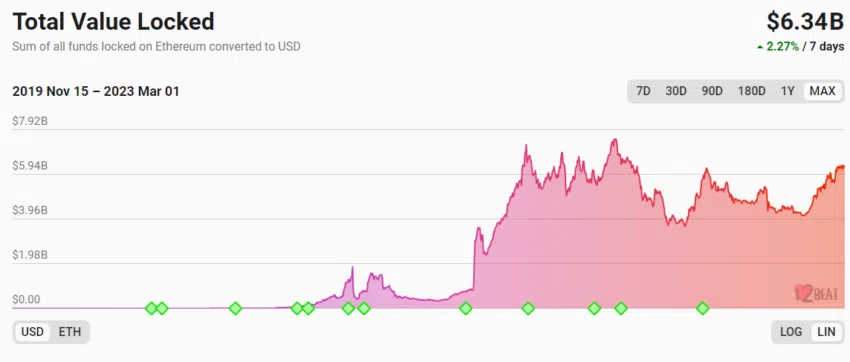 Całkowita ilość zablokowanych środków na platformach drugiej warstwy wynosi obecnie 6,34 miliarda USD. Oznacza to wzrost aż o 53% od początku 2023 roku. Zarazem jest to spadek o jedynie 15% względem maksymalnej wartości, która przypadła na kwiecień 2022. Według L2Beat wynosiła ona w tamtym miesiącu 7,47 miliarda USD.