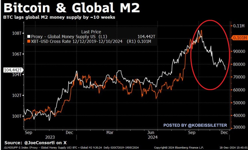 „Gdy globalna podaż pieniądza osiągnęła nowy rekord 108,5 bln USD w październiku, ceny Bitcoina osiągnęły rekordowy poziom 108 000 USD. W ciągu ostatnich 2 miesięcy jednak podaż pieniądza spadła o 4,1 bln USD, do 104,4 bln USD, najniższego poziomu od sierpnia. Jeśli relacja nadal się utrzyma, sugeruje to, że ceny Bitcoina mogą spaść nawet o 20 000 USD w ciągu najbliższych kilku tygodni.”