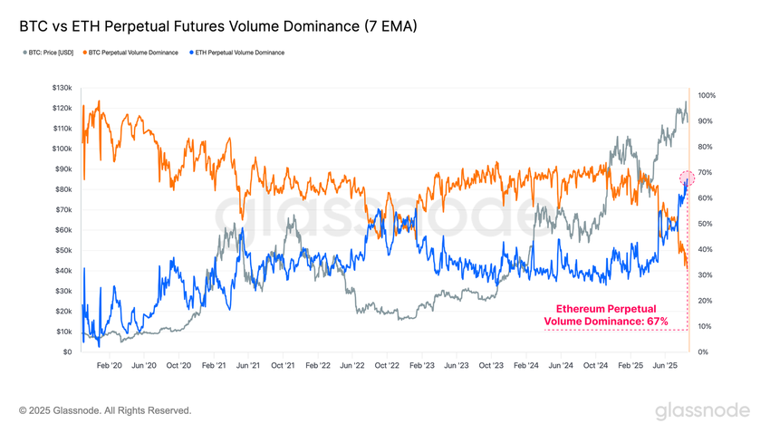 Tymczasem ten trend jest jeszcze bardziej widoczny w wolumenie handlu. Udział Ethereum w wolumenie handlu wieczystymi kontraktami terminowymi osiągnął rekordowy poziom (ATH), wynoszący 67%.