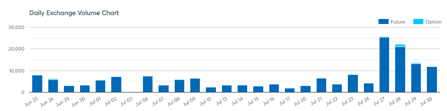 Wolumen w poniedziałek na CME przekroczył 1,3 miliarda USD, a tak zwane Open Interest czyli liczba nierozliczonych kontraktów pochodnych, również wzrosła do 724 milionów USD. Według danych CME w poniedziałek handlowano 25 493 kontraktami futures, a we wtorek było to 20 939 kontraktów.