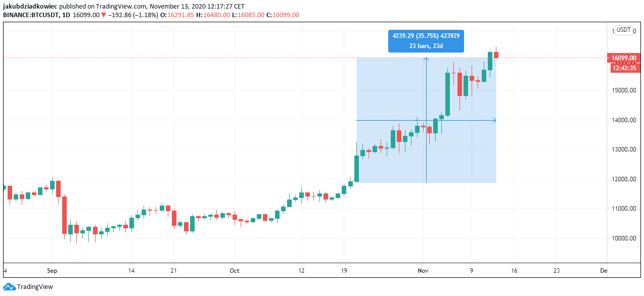 Według danych z Tradingview, od ogłoszenia przez PayPal wejścia na rynek krypto w dniu 21 października do dzisiaj cena Bitcoina wzrosła o 35,75%.