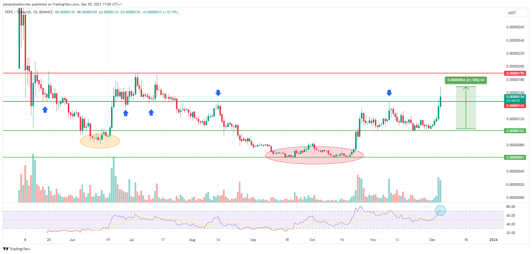 Następnie w okresie od połowy września do połowy października PEPE wygenerował wzorzec podwójnego dna w obszarze 0,00000061 USD (czerwona elipsa). Późniejszy ruch w górę zatwierdził opór na kluczowym poziomie 0,00000147 USD. Obszar ten wielokrotnie działał jako wsparcie i opór (niebieskie strzałki), więc jest kluczowy do określenia kierunku trendu.