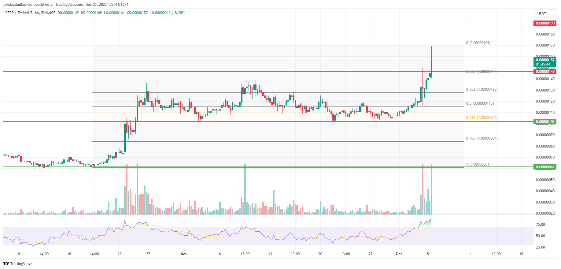 Na niższym, 6-godzinnym przedziale czasowym dostrzegamy, że wybicie powyżej kluczowego oporu na 0,00000147 USD jest wspierane przez rosnący wolumen obrotu. Co więcej, również RSI znajduje się głęboko na wykupionym terytorium (powyżej 88), lecz jeszcze nie wygenerowało niedźwiedziej dywergencji.