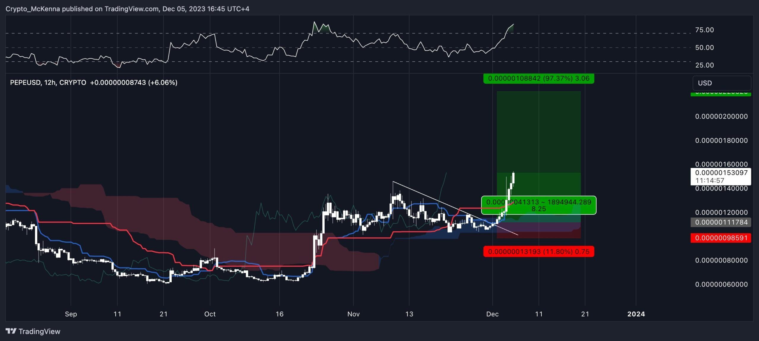 „Teraz nie jest czas na FOMO na $PEPE, wybicie powyżej tej spadkowej linii trendu nastąpiło idealnie. Powinniśmy poczekać na retest i zobaczyć, czy się utrzyma.”