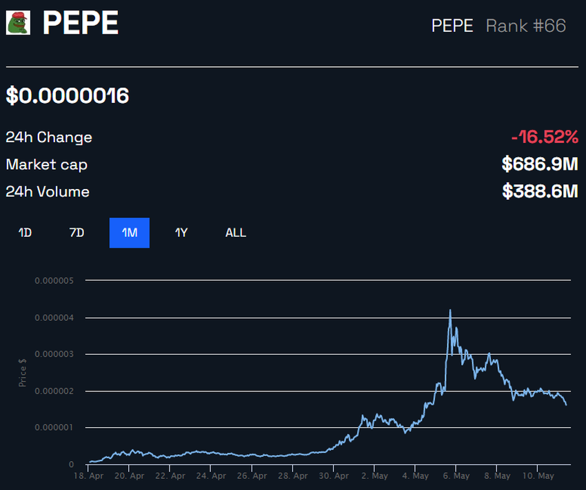 Przed rozpoczęciem spadku w dniu 5 maja, cena memecoina Pepe (PEPE) była liderem zysków na rynku kryptowalut od początku kwietnia. W chwili pisania tego tekstu, memecoin nadal spada, tracąc ponad 16% w ciągu ostatnich 24 godzin.