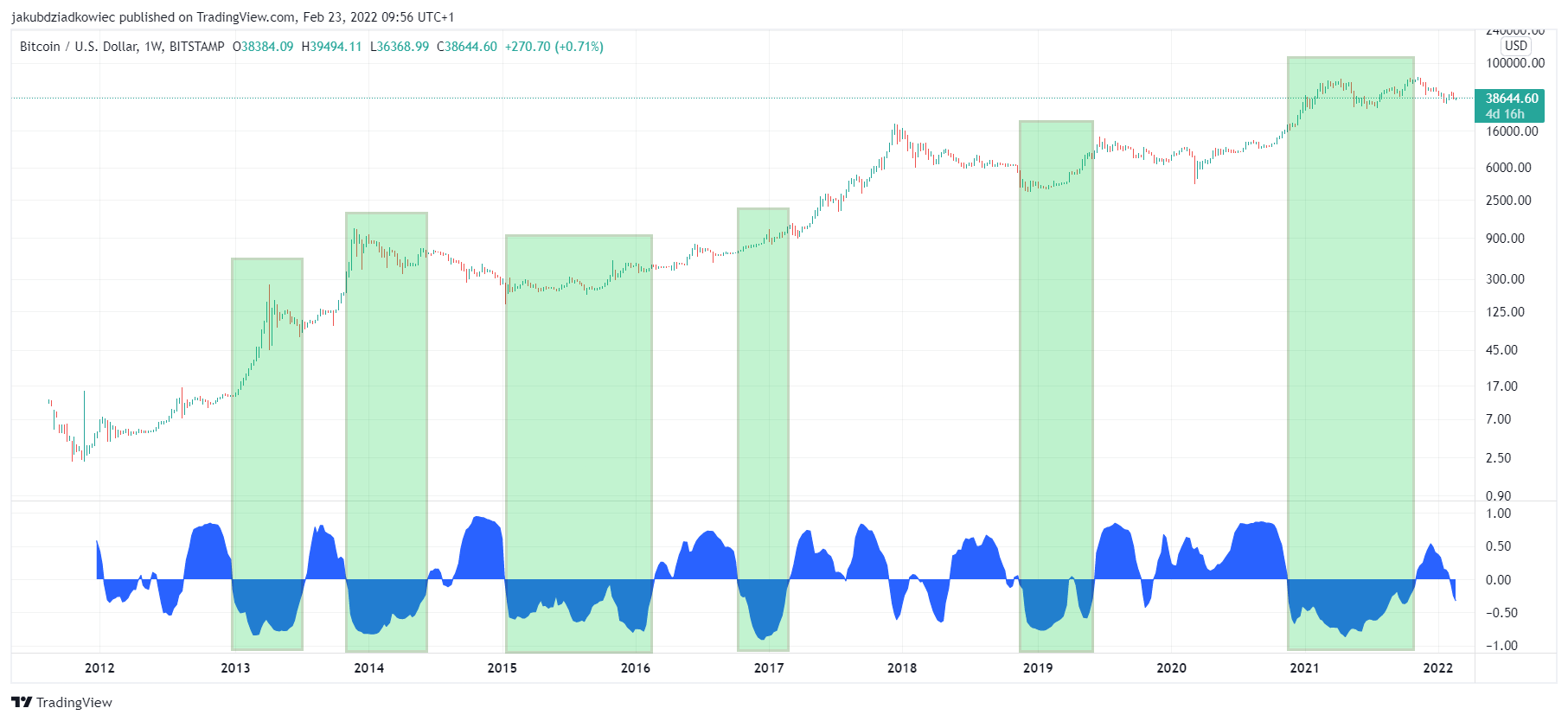 Okazuje się, że korelacja (niebieski wykres) była czasem pozytywna (powyżej 0) – cena Bitcoina rosła lub spadała wraz z ceną złota – a czasem negatywna (poniżej 0) – cena Bitcoina rosła a złota spadała lub vice versa. Co ciekawe, w okresach, gdy korelacja była negatywna (zielone obszary) cena Bitcoina najczęściej doświadczała intensywnych wzrostów.